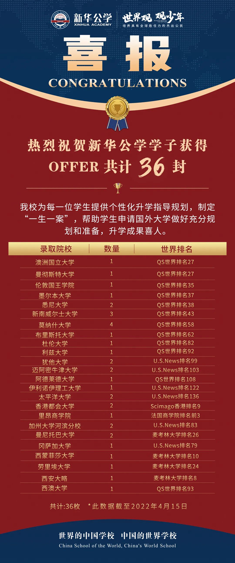 在競(jìng)爭(zhēng)異常激烈的申請(qǐng)季里,新華學(xué)子表現(xiàn)不俗,收獲了豐碩的成果。2021-2022學(xué)年新華公學(xué)迎來首屆12年級(jí)畢業(yè)生,9名學(xué)生一共收獲36枚Offer,其中不乏世界TOP10名校。
