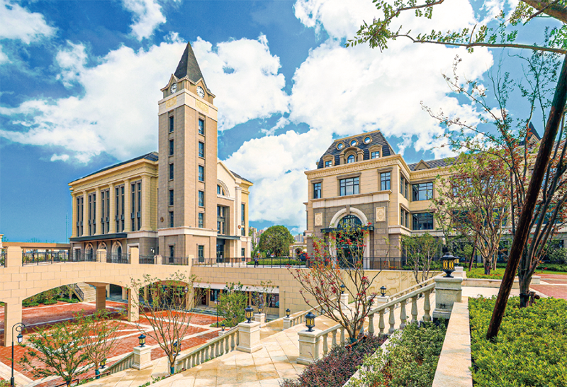 新華公學(xué)建筑風(fēng)格繼承了古典主義經(jīng)典美學(xué)原則,配以現(xiàn)代簡(jiǎn)約的設(shè)計(jì)演繹,使得校園具有端莊雅致、成熟內(nèi)斂的整體建筑風(fēng)貌。圍繞建筑形成了花園式的多重院落空間,為師生打造了綠意盎然的生態(tài)景觀體系,滿足了“公共”及“獨(dú)立”的多樣化需求:軸線由入口空間展開,打造秩序感公共空間,空間類型豐富;中心核心庭院廣場(chǎng),整個(gè)校區(qū)的核心亮點(diǎn)空間;教學(xué)區(qū)每塊設(shè)置各自的課間活動(dòng)庭院;生活區(qū)設(shè)置運(yùn)動(dòng)場(chǎng)地和花園田園等休閑與生活拓展空間。