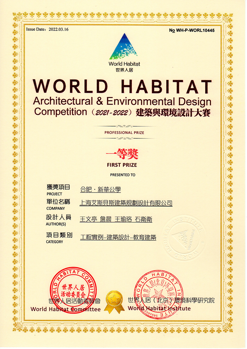 近日,WORLD HABITAT(2021-2022)建筑與環(huán)境設(shè)計(jì)大賽(Berlin Design Awards)于世界人居官方網(wǎng)站公布了獲獎(jiǎng)名單,新華公學(xué)校園建筑一舉斬獲「2021-2022建筑與環(huán)境設(shè)計(jì)大賽專業(yè)組」一等獎(jiǎng)。