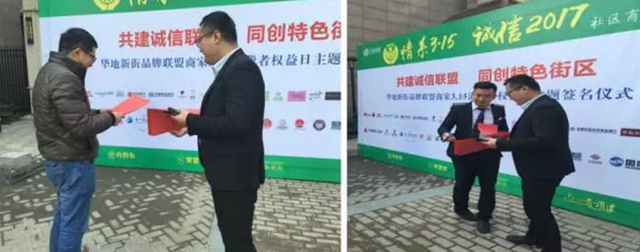 2017年3月15日,“華地新街品牌聯盟商家3·15消費者權益日”主題簽名儀式在華地新街隆重舉行。上午10時,各商戶代表齊聚在品牌墻下,由商業公司工作人員向大家宣讀并發放《倡議書》,各商戶代表在品牌墻上鄭重簽名,為共建誠信聯盟,共創特色街區而簽下鄭重的承諾。