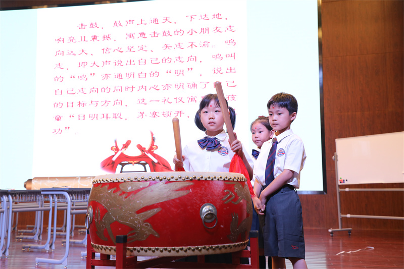 擊鼓三聲,以示從今啟蒙,以立志向。一通鼓:學子如斯,高山景行;二通鼓:五育并舉,六藝均衡;三通鼓:開筆啟智,慧悅人生。