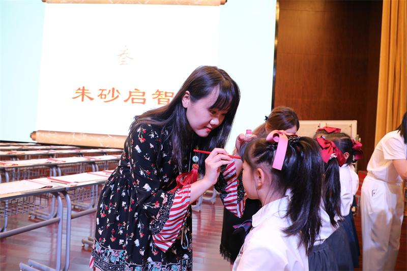 額間點紅痣,心中有智慧。將美好祝愿凝聚在這朱砂的中國紅上,相信同學們一定會成為至善博學的人!