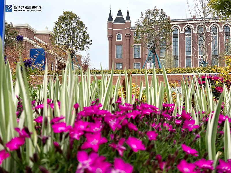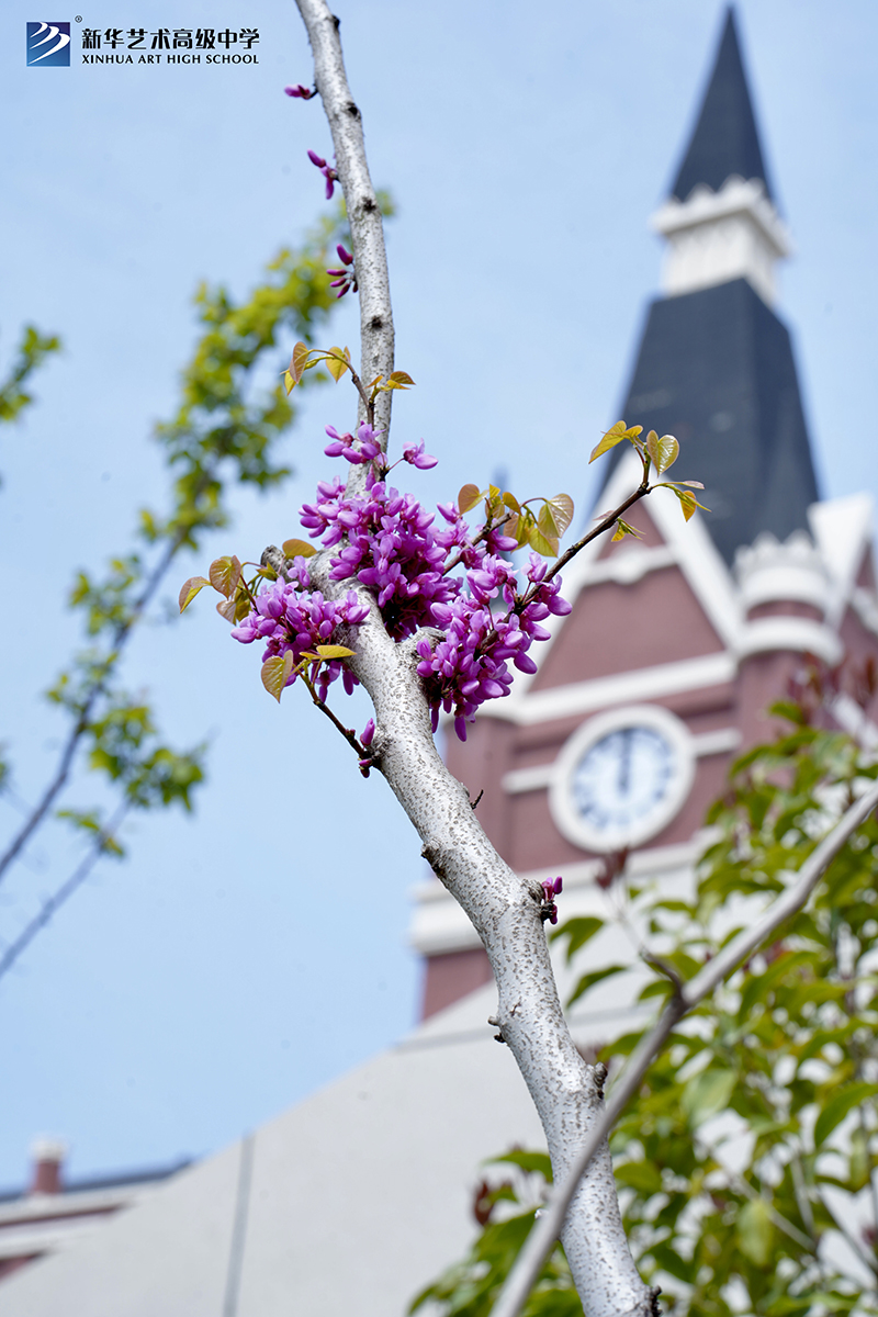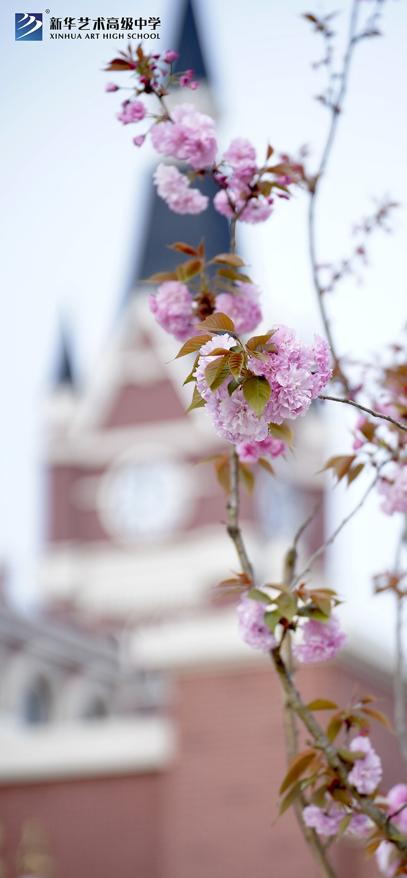 嫩綠的新芽與磚紅的教學(xué)樓映襯