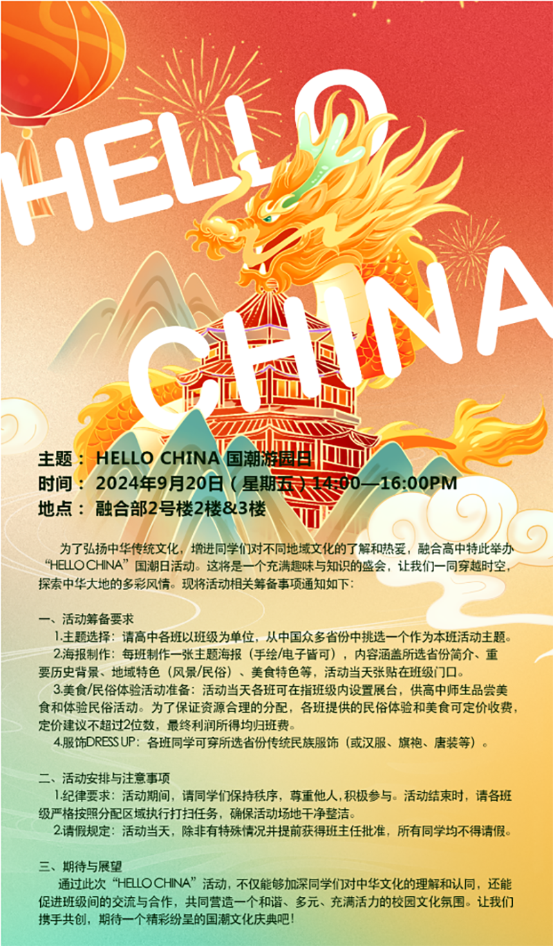為進(jìn)一步弘揚(yáng)中華傳統(tǒng)文化,增進(jìn)學(xué)生們對不同地域文化的了解和熱愛,融合高中部于近日成功舉辦了一場別開生面的“HELLO CHINA”國潮游園活動(dòng)。旨在通過一系列趣味橫生、知識豐富的活動(dòng)形式,讓學(xué)生們近距離感受中華文化的博大精深。